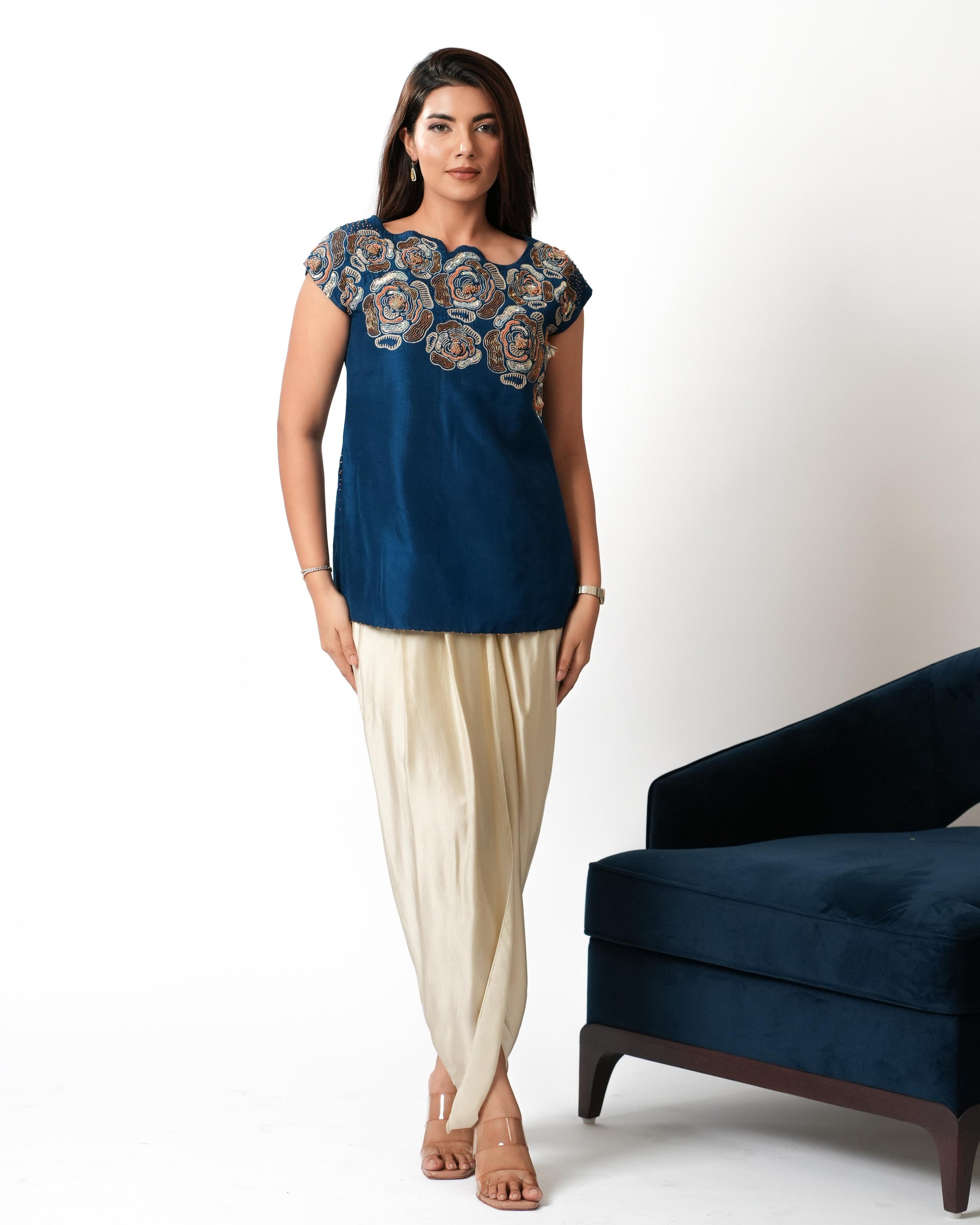 A delicate blue top adorned with hand-block printed roses and intricate hand embroidery, paired with cream-colored dhoti pants. The combination of floral elegance and rich craftsmanship offers a refined yet relaxed look, blending tradition with modern flair for a timeless appeal.