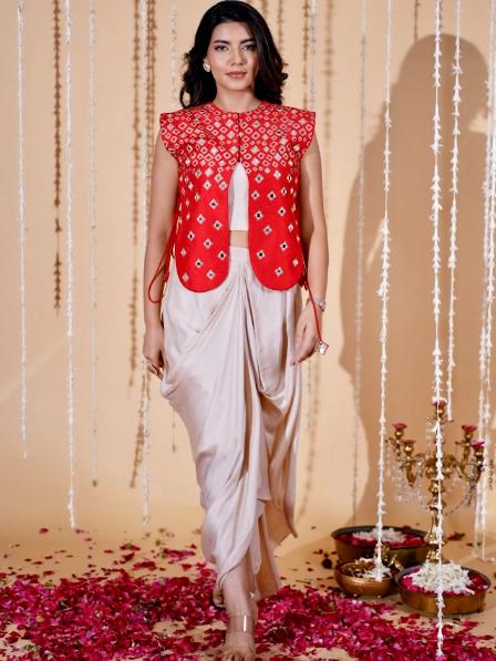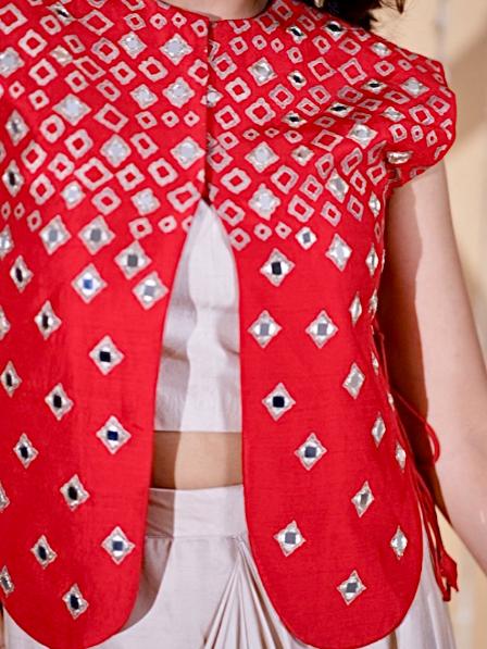 This captivating red bib top features a stunning hand-block print, enriched with intricate mirror work that catches the light with every movement. The delicate knot detailing on the sides adds a touch of texture and refinement, making it a truly unique piece. Paired with a cream bustier, the outfit balances vibrant color with subtle elegance. For a complete ensemble, the top can be paired with a cream cowl skirt, creating a chic, fluid silhouette. Perfect for festive occasions, this set combines traditional craftsmanship with modern style for a look that's both bold and graceful.