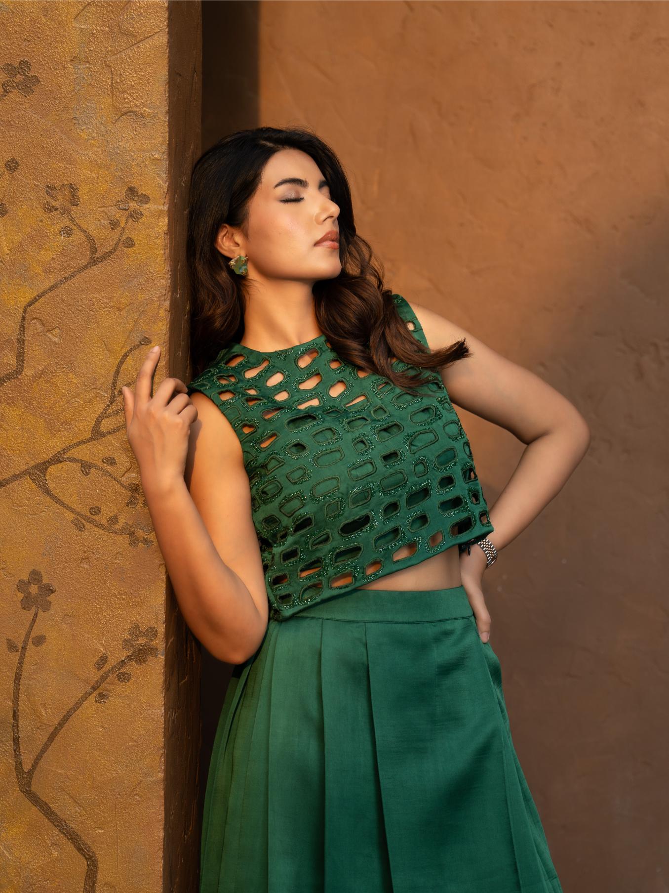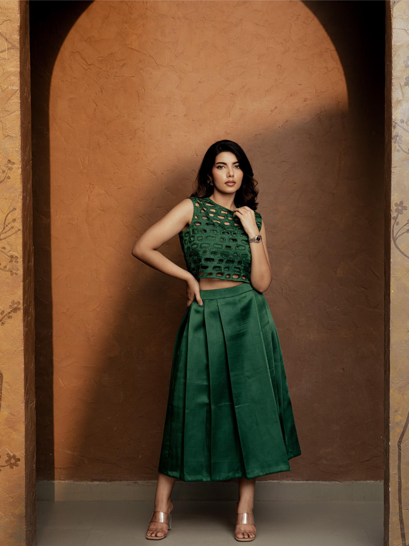 A striking green cutwork top with hand embroidery, paired with a box-pleated skirt. Perfect for evening parties—modern, elegant, and effortlessly stylish.
