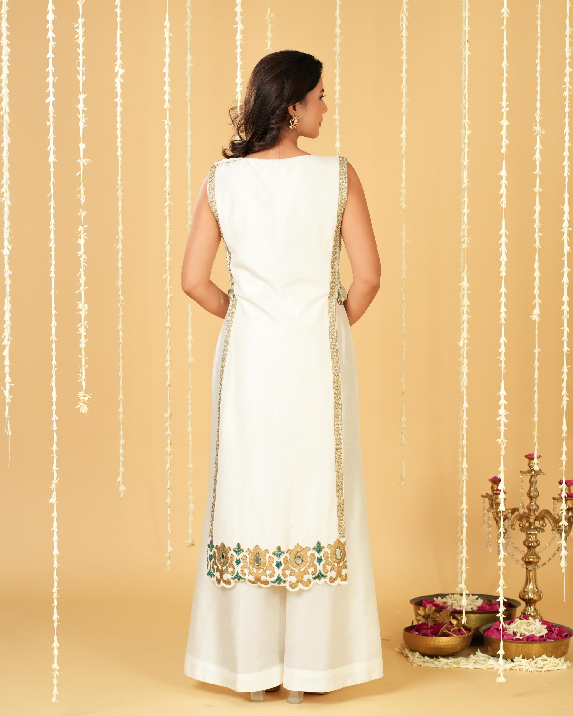 A dreamy white bib dress adorned with delicate blue side detailing and intricate mirror hangings that shimmer with every move. This statement piece pairs effortlessly with crisp white flared pants.