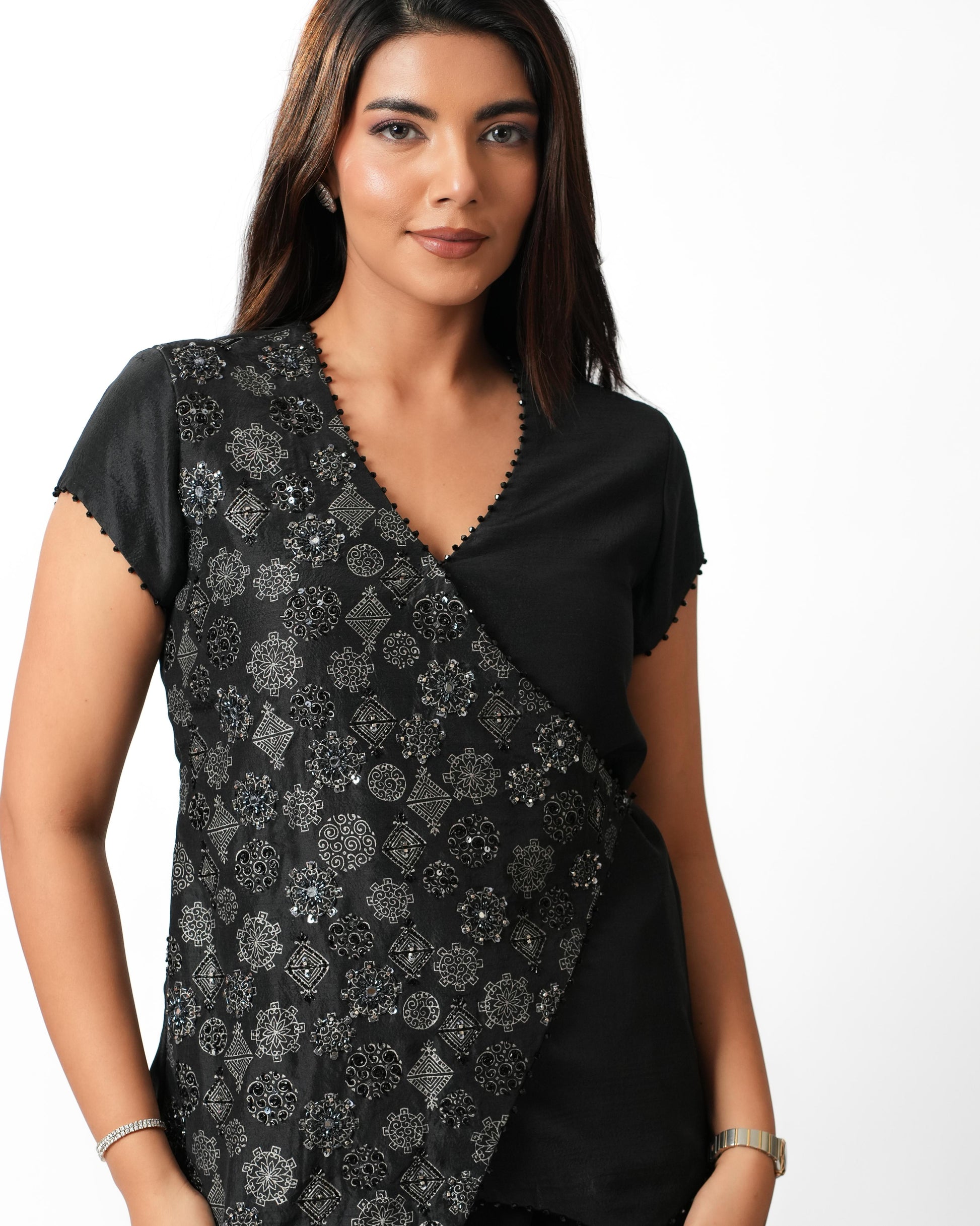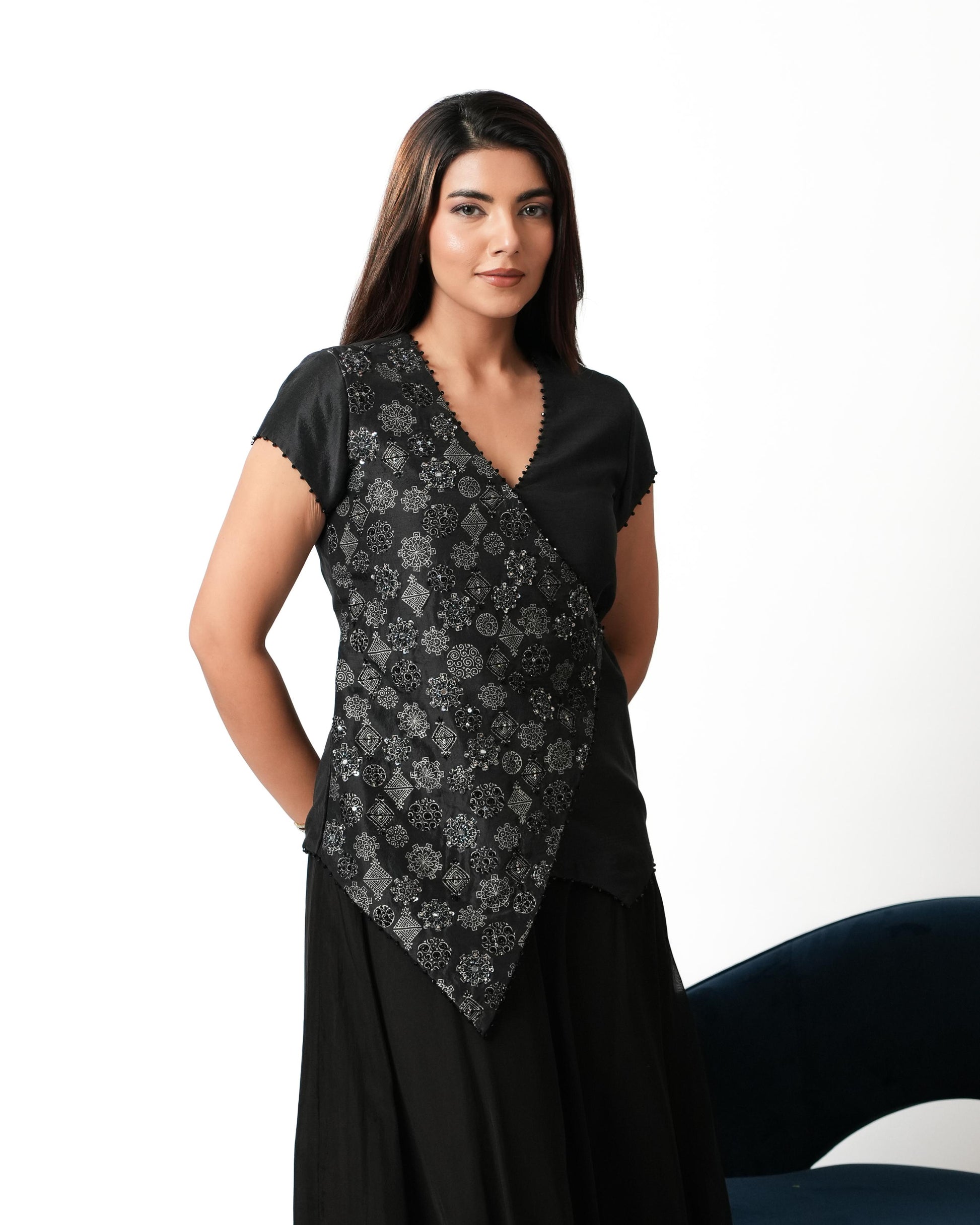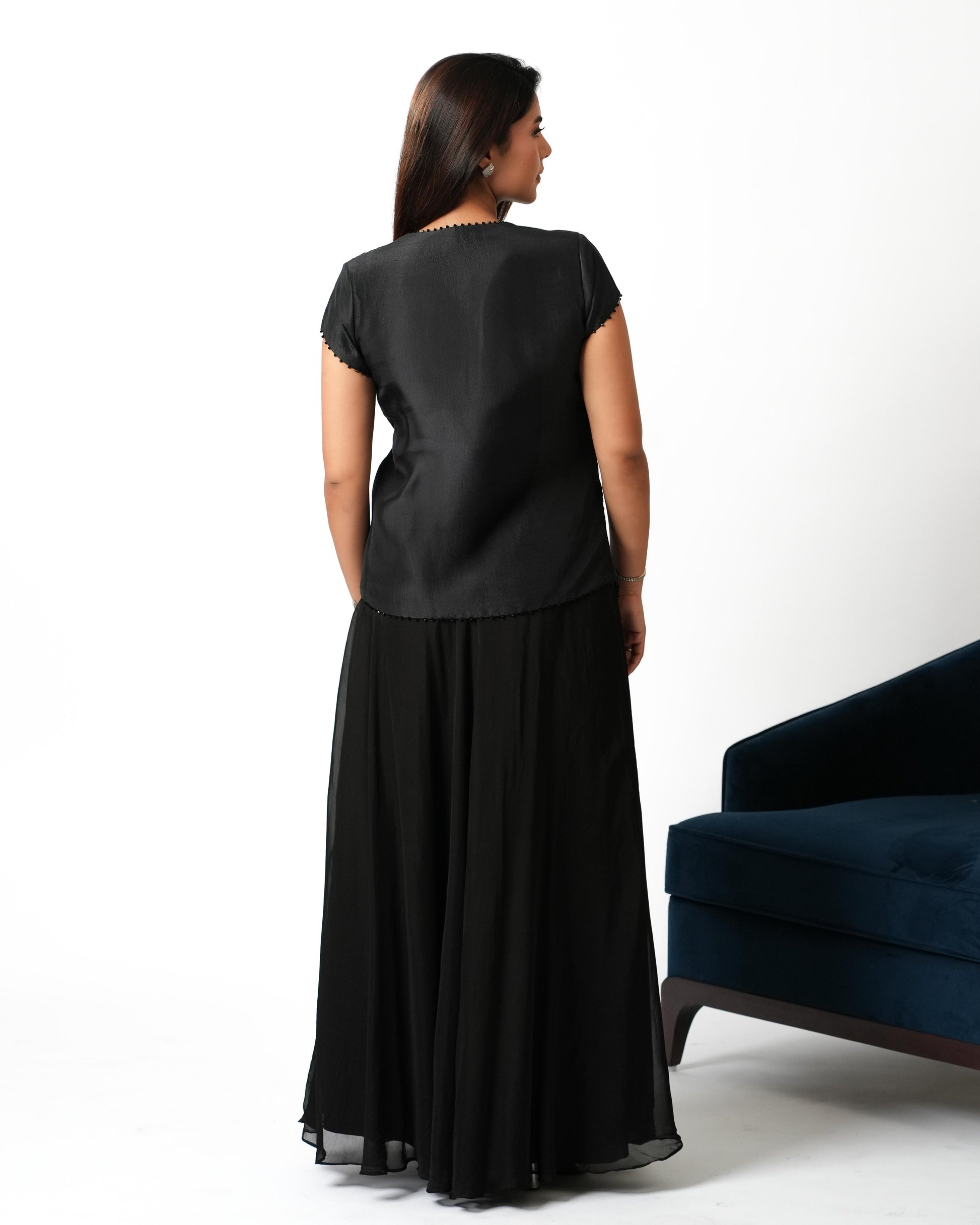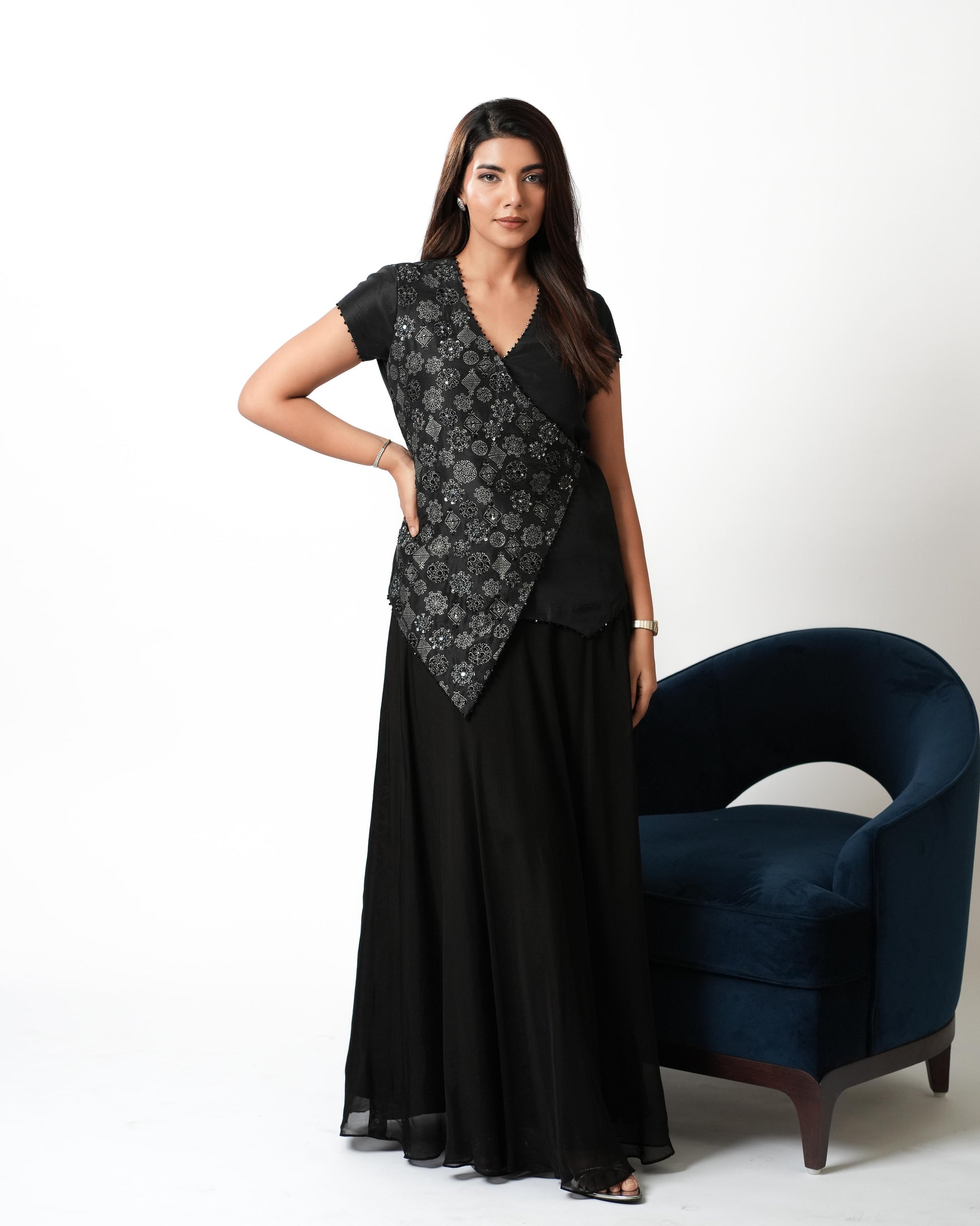 A black tie-up top that features multiple booti motifs with hand block prints and delicate hand embroidery, paired with a flowing black organza skirt. A perfect blend of tradition and modern elegance.