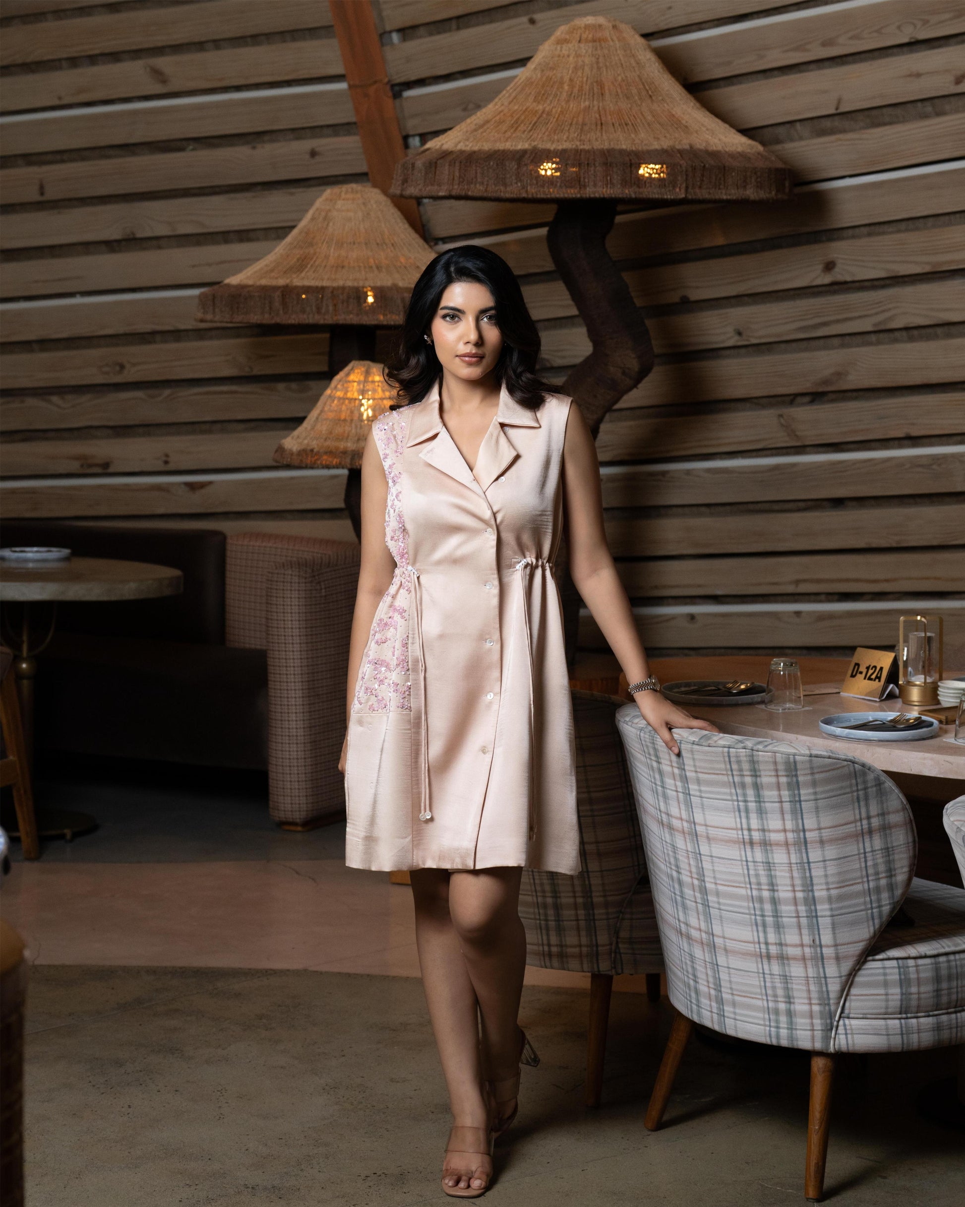 The Peach Gleam Dress blends soft sophistication with subtle glamour. Crafted in a warm peach tone, this dress features exquisite hand-sequined detailing on one side, creating a graceful asymmetry that draws the eye. A delicate tie-up at the waist allows for a flattering, adjustable fit, accentuating the silhouette with understated charm. Ideal for both intimate gatherings and daytime celebrations, it’s a timeless piece with a touch of sparkle.