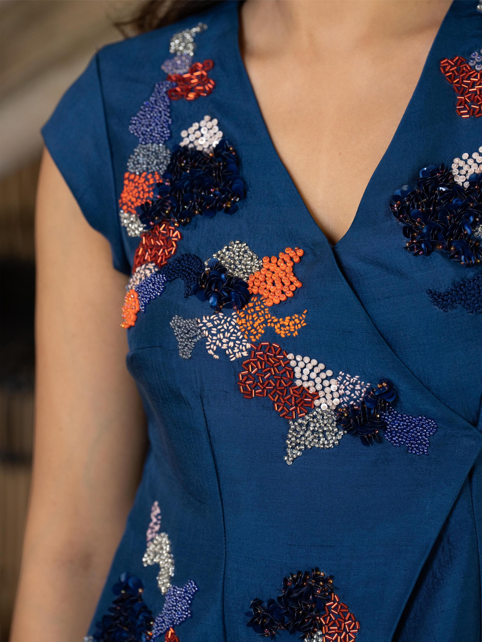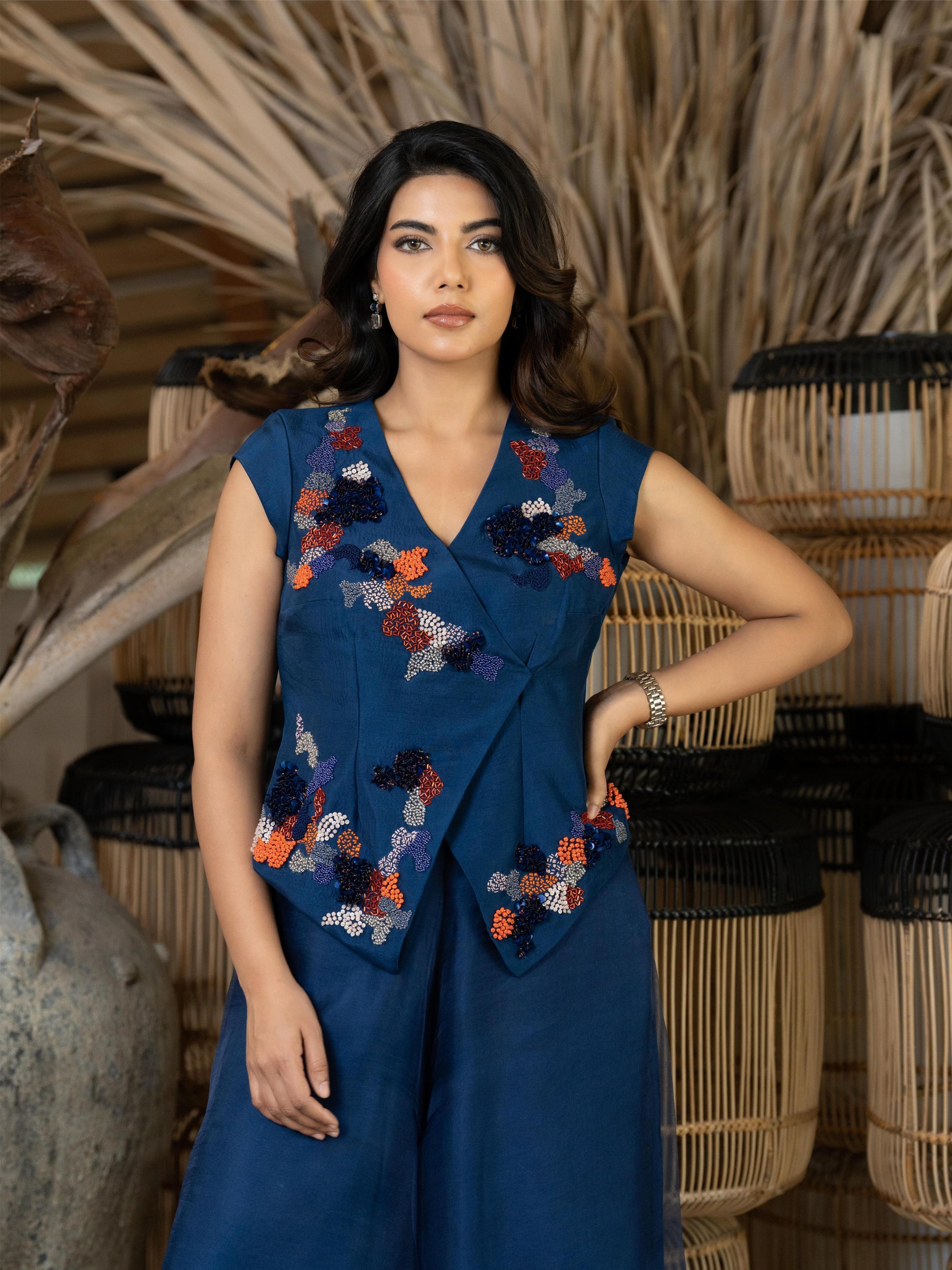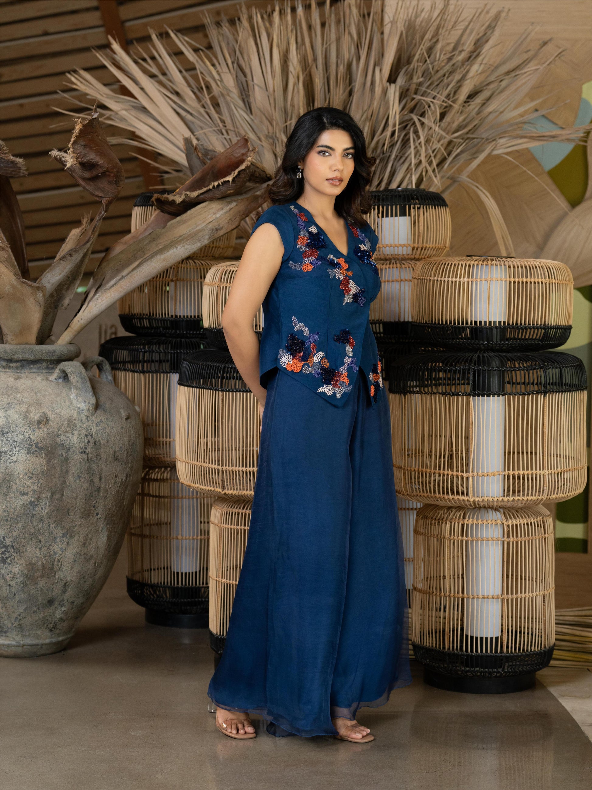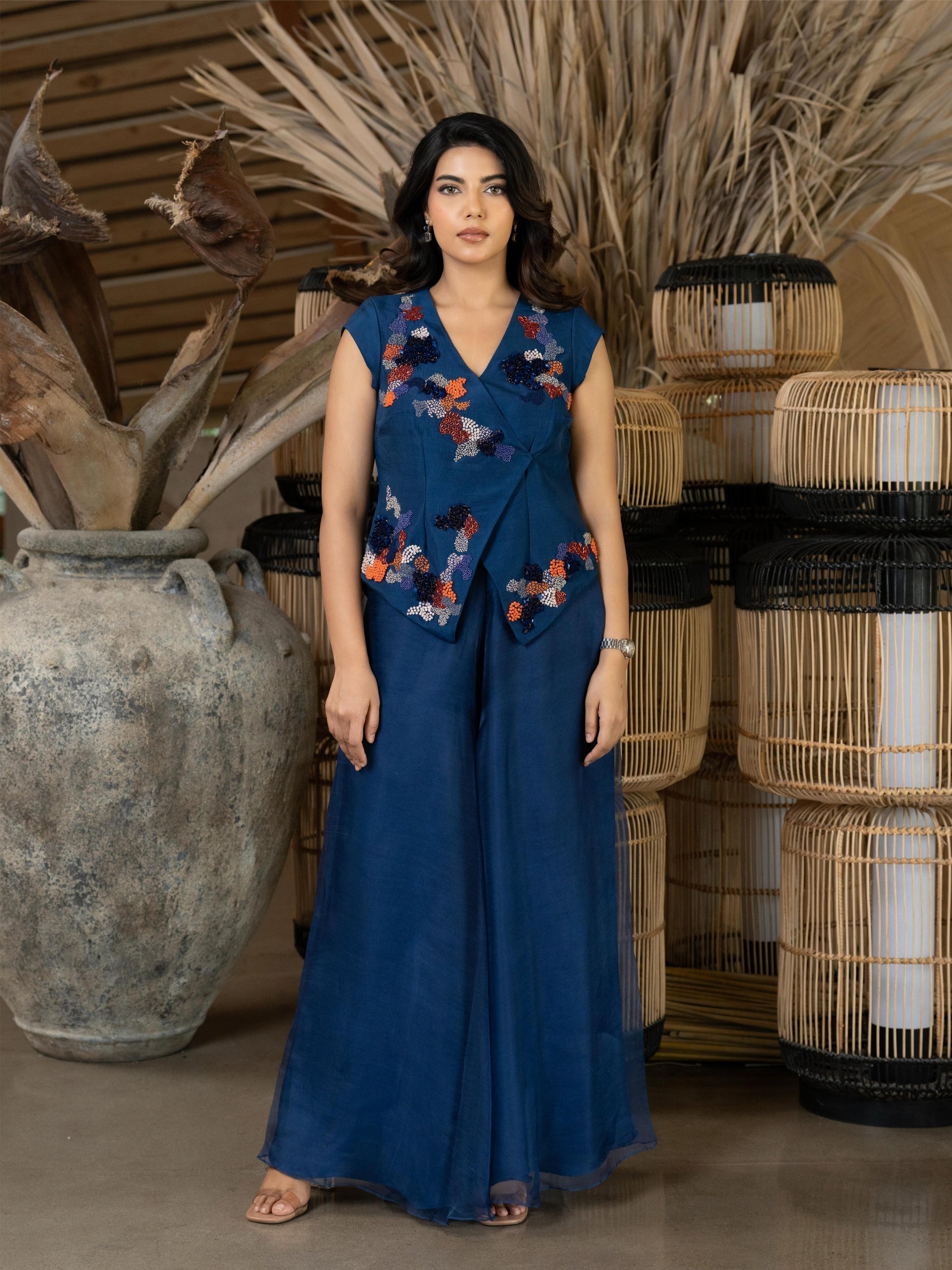 Step into elegance with Sapphire glow — a chic Indo-Western ensemble that beautifully blends tradition with modern flair. The deep blue top, adorned with intricate appliqué work, features delicate hand embroidery in vibrant pops of orange, adding a playful yet refined touch. Paired with soft, flared organza pants that flow gracefully with every step, this outfit is perfect for festive gatherings or elegant soirées. A stunning fusion of comfort, color, and craftsmanship.