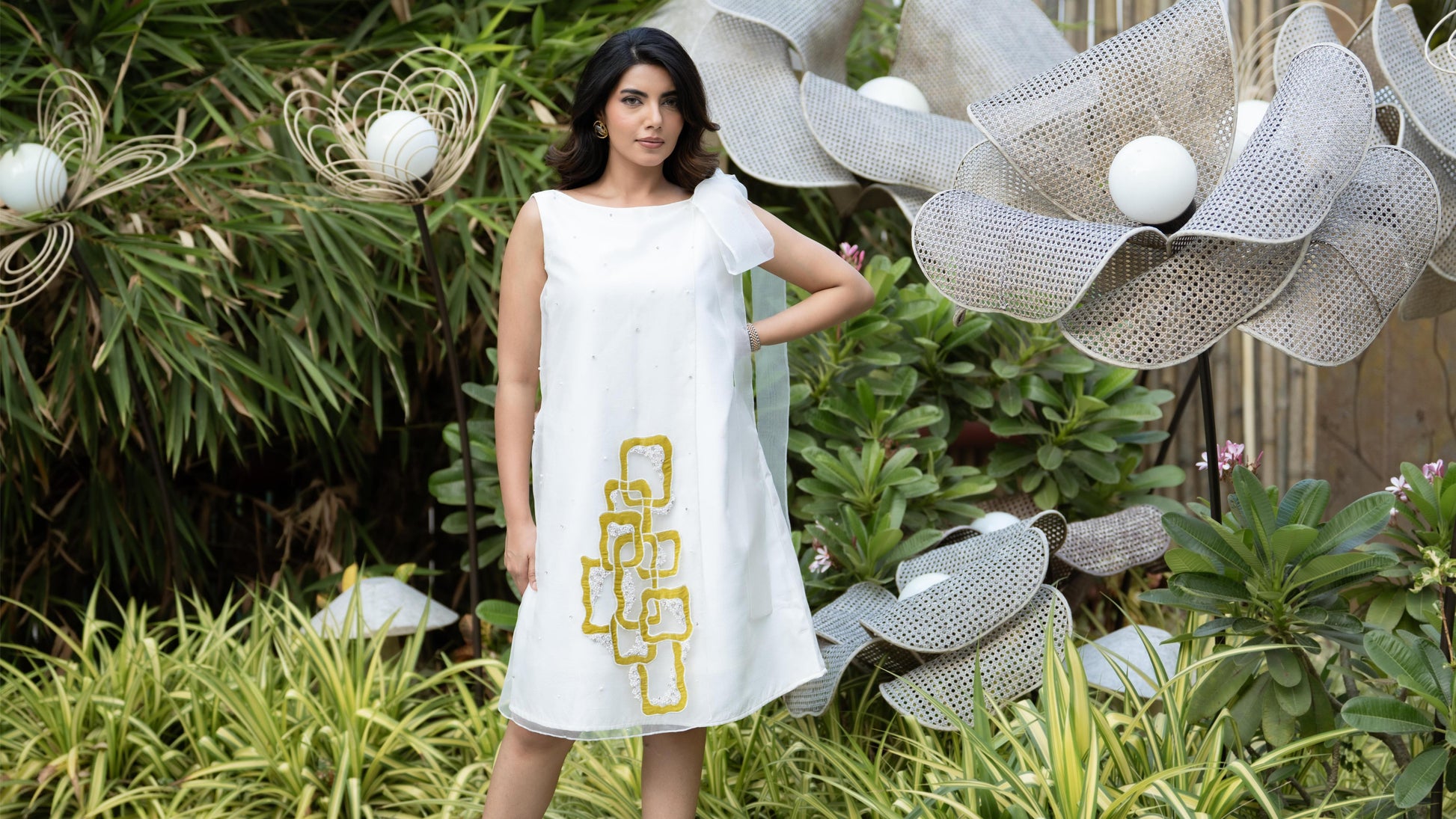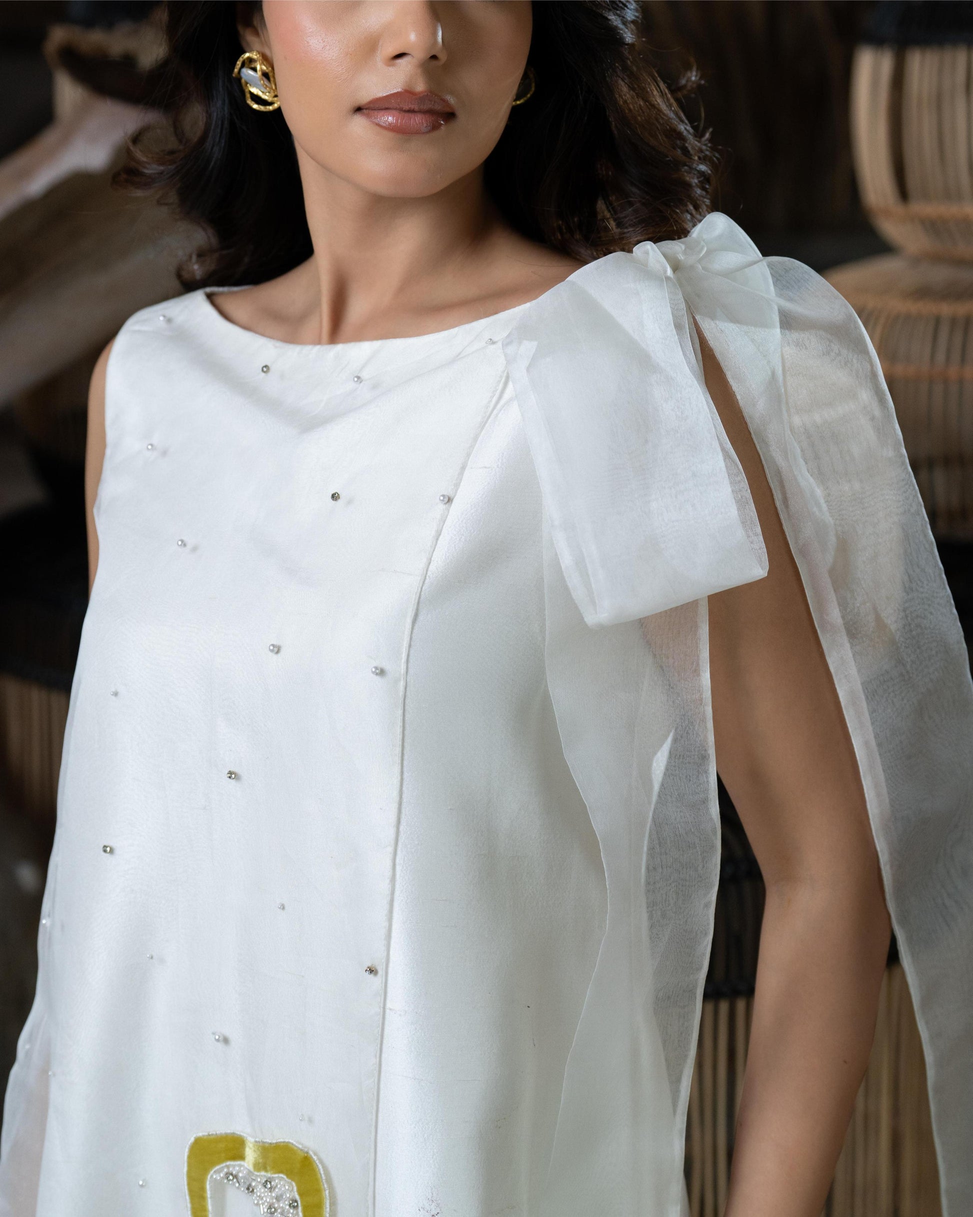 This stunning white dress features a soft organza flap that cascades elegantly, paired with a matching organza bow for an extra touch of whimsy. The flap is beautifully adorned with vibrant green velvet appliqué work, creating a bold contrast against the pure white fabric. Delicate pearl accents highlight the appliqué, adding a layer of refinement and sophistication. Perfect for occasions where you want to stand out with grace and elegance.